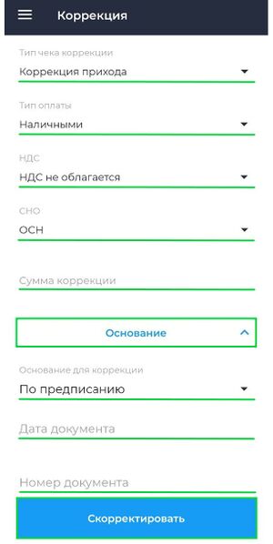 При работе в приложении Касса Android в разделе Касса перейдите в подраздел Коррекция.
