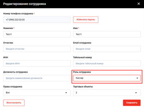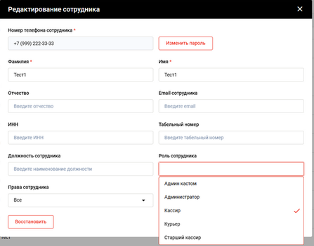 - В появившейся карточке сотрудника нажмите на поле “Роль сотрудника”