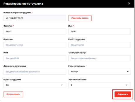 - В карточке сотрудника нажмите кнопку Сохранить.